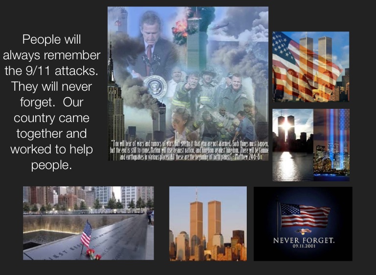 People will always remember the 9/11 attacks. They will never forget. Our country came together and worked to help people.