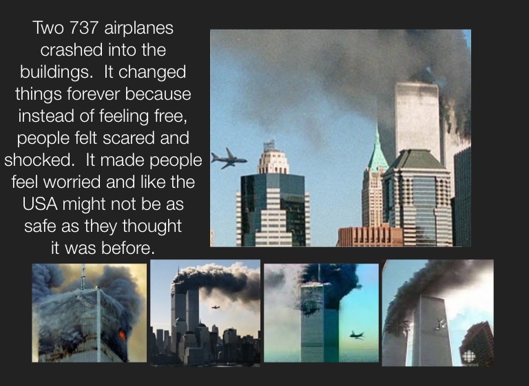 Two 737 airplanes crashed into the buildings. It changed things forever because instead of feeling free, people felt scared and shocked. It made people feel worried and like the USA might not be as