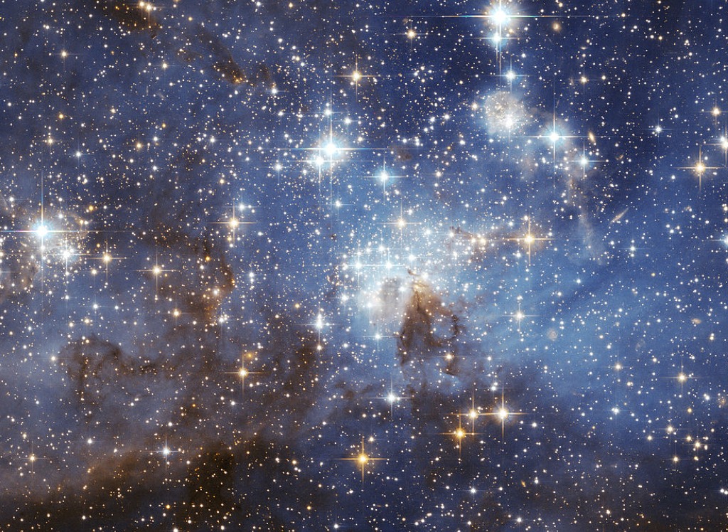 Significant contrast between the dark shades of blue and the bright yellow and oranges.