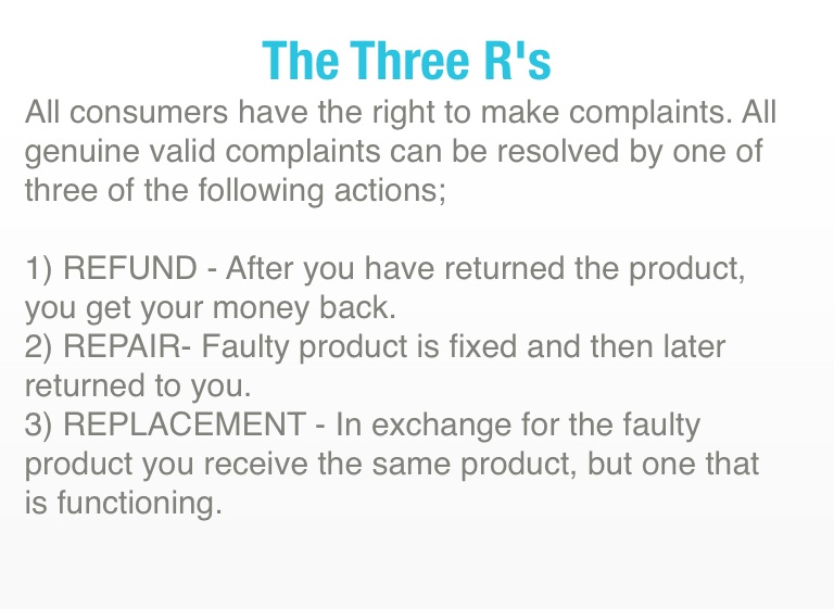 All consumers have the right to make complaints. All genuine valid complaints can be resolved by one of three of the following actions;