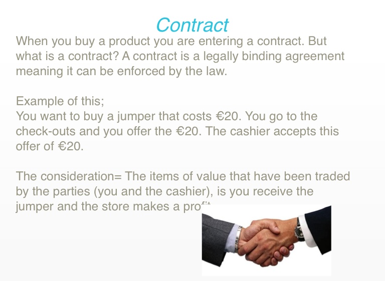 When you buy a product you are entering a contract. But what is a contract? A contract is a legally binding agreement meaning it can be enforced by the law.