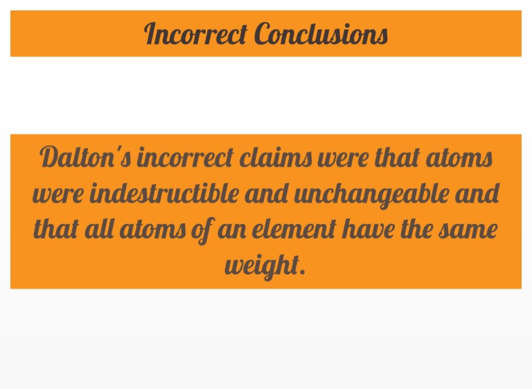 Dalton's incorrect claims were that atoms were indestructible and unchangeable and that all atoms of an element have the same weight.