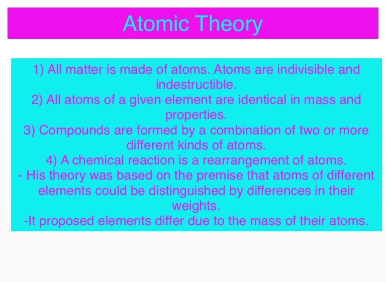 - His theory was based on the premise that atoms of different elements could be distinguished by differences in their weights.