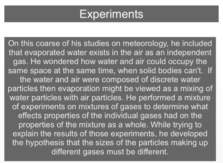 On this coarse of his studies on meteorology, he included that evaporated water exists in the air as an independent gas. He wondered how water and air could occupy the same space at the same time, when solid bodies can't. If the water and air were composed of discrete water particles then evaporation might be viewed as a mixing of water particles with air particles. He performed a mixture of experiments on mixtures of gases to determine what effects properties of the individual gases had on the properties of the mixture as a whole. While trying to explain the results of those experiments, he developed the hypothesis that the sizes of the particles making up different gases must be different.
