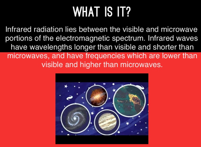 Infrared radiation lies between the visible and microwave portions of the electromagnetic spectrum. Infrared waves have wavelengths longer than visible and shorter than microwaves, and have frequencies which are lower than visible and higher than microwaves.