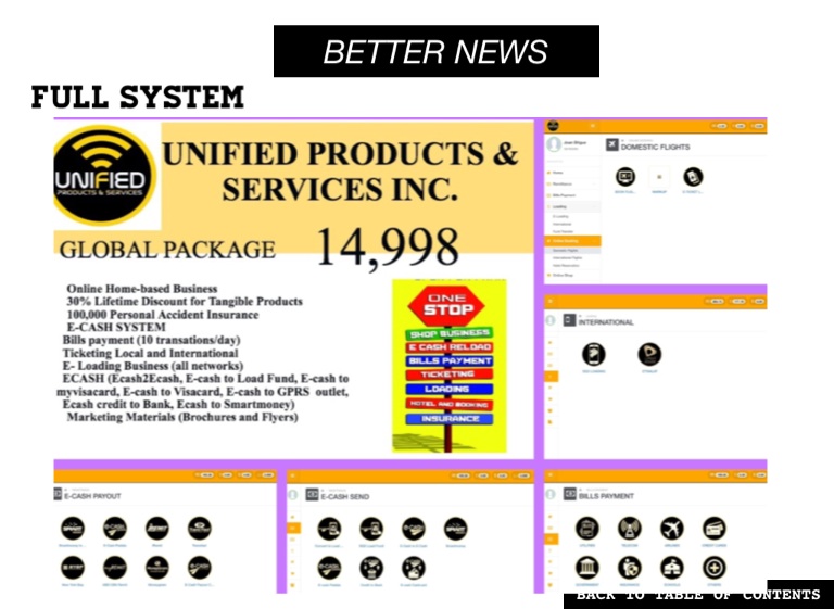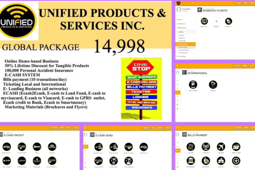 Best Franchise Business for 2019 Unified Products & Services is offering a ready-to-operate system that allows you to do the following businesses: 1. Remittance The connection of the Unified system with the Corporate Partners allows various options for you to send money depends on your client needs. a. Outlet to Outlet transfers b. Cebuana Outlets Nationwide c. Smart Money Padala Outlets Nationwide d. Credit to banks (61 Banks) e.Western Union f. Cardless Padala at any Security Bank ATM Machine And can process international remittance a. I-remit, b. Transfast c. Money gram d. ABS - CBN MyRemit e. New York Bay And ecash top up with a. RD Pawnshops nationwide b. Kwartagram outlets nationwide c. Triple Platinum Pawnshops d. Davaoena Pawnshops e. Dominion Pawnshops f. Maria Gracia Pawnshops g. Dalton Pawnshops h. St. Patrick Pawnshops i. Global Pinoy Remittance Outlets j. Esquisite Pawnshops and even cooperatives. 2. Bills Payment Payments for a range of billing partners, through its partnership with Unified, provide additional payment venues to clients/subscribers of water utilities, power companies, insurance providers, credit cards, telecommunication bills, schools tuitions, foundations and even cable companies. (100+ Billers including SSS, PLDT, Meralco, SMART, SUN, GLOBE, INNOVE and more!!! 3. Loading This allows real-time top-up of electronic wallets to support online games, Internet providers and major telecommunications in the Philippines -GLOBE, SMART and SUN and even international Telcos like Etisalat, Singtel, M1, Star Hub. 4.Ticketing/Travel and Tours/Hotel Booking (Domestic and International) This service integrates major domestic and international airline and shipping companies, even hotel accommodations, to allow travelers ease in schedule selection, booking, purchasing and securing tickets and direct booking with over 400 Airlines affiliates. 5. Insurance This service provides personal accident insurance to community members. Each insured is entitle to receive a specific amount for the death/or Disablement as a result of a covered accident. For Franchising,pls contact sir Joener Sison 09369896861/09460905401 For more franchise info, visit us @upsunifiedproductsservicesbacolod.weebly.com