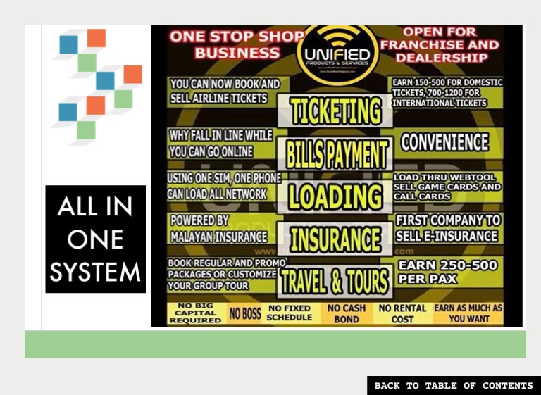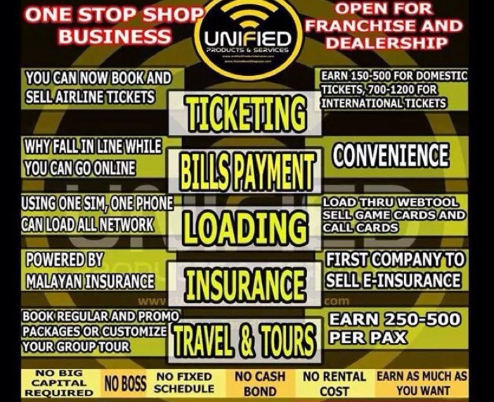 Best Franchise Business for 2019 Unified Products & Services is offering a ready-to-operate system that allows you to do the following businesses: 1. Remittance The connection of the Unified system with the Corporate Partners allows various options for you to send money depends on your client needs. a. Outlet to Outlet transfers b. Cebuana Outlets Nationwide c. Smart Money Padala Outlets Nationwide d. Credit to banks (61 Banks) e.Western Union f. Cardless Padala at any Security Bank ATM Machine And can process international remittance a. I-remit, b. Transfast c. Money gram d. ABS - CBN MyRemit e. New York Bay And ecash top up with a. RD Pawnshops nationwide b. Kwartagram outlets nationwide c. Triple Platinum Pawnshops d. Davaoena Pawnshops e. Dominion Pawnshops f. Maria Gracia Pawnshops g. Dalton Pawnshops h. St. Patrick Pawnshops i. Global Pinoy Remittance Outlets j. Esquisite Pawnshops and even cooperatives. 2. Bills Payment Payments for a range of billing partners, through its partnership with Unified, provide additional payment venues to clients/subscribers of water utilities, power companies, insurance providers, credit cards, telecommunication bills, schools tuitions, foundations and even cable companies. (100+ Billers including SSS, PLDT, Meralco, SMART, SUN, GLOBE, INNOVE and more!!! 3. Loading This allows real-time top-up of electronic wallets to support online games, Internet providers and major telecommunications in the Philippines -GLOBE, SMART and SUN and even international Telcos like Etisalat, Singtel, M1, Star Hub. 4.Ticketing/Travel and Tours/Hotel Booking (Domestic and International) This service integrates major domestic and international airline and shipping companies, even hotel accommodations, to allow travelers ease in schedule selection, booking, purchasing and securing tickets and direct booking with over 400 Airlines affiliates. 5. Insurance This service provides personal accident insurance to community members. Each insured is entitle to receive a specific amount for the death/or Disablement as a result of a covered accident. For Franchising,pls contact sir Joener Sison 09369896861/09460905401 For more franchise info, visit us @upsunifiedproductsservicesbacolod.weebly.com
