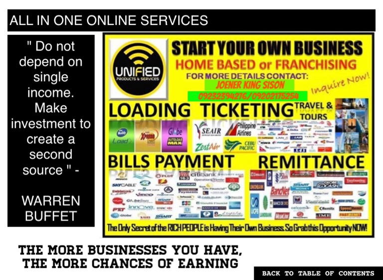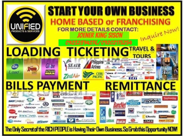 Best Franchise Business for 2019 Unified Products & Services is offering a ready-to-operate system that allows you to do the following businesses: 1. Remittance The connection of the Unified system with the Corporate Partners allows various options for you to send money depends on your client needs. a. Outlet to Outlet transfers b. Cebuana Outlets Nationwide c. Smart Money Padala Outlets Nationwide d. Credit to banks (61 Banks) e.Western Union f. Cardless Padala at any Security Bank ATM Machine And can process international remittance a. I-remit, b. Transfast c. Money gram d. ABS - CBN MyRemit e. New York Bay And ecash top up with a. RD Pawnshops nationwide b. Kwartagram outlets nationwide c. Triple Platinum Pawnshops d. Davaoena Pawnshops e. Dominion Pawnshops f. Maria Gracia Pawnshops g. Dalton Pawnshops h. St. Patrick Pawnshops i. Global Pinoy Remittance Outlets j. Esquisite Pawnshops and even cooperatives. 2. Bills Payment Payments for a range of billing partners, through its partnership with Unified, provide additional payment venues to clients/subscribers of water utilities, power companies, insurance providers, credit cards, telecommunication bills, schools tuitions, foundations and even cable companies. (100+ Billers including SSS, PLDT, Meralco, SMART, SUN, GLOBE, INNOVE and more!!! 3. Loading This allows real-time top-up of electronic wallets to support online games, Internet providers and major telecommunications in the Philippines -GLOBE, SMART and SUN and even international Telcos like Etisalat, Singtel, M1, Star Hub. 4.Ticketing/Travel and Tours/Hotel Booking (Domestic and International) This service integrates major domestic and international airline and shipping companies, even hotel accommodations, to allow travelers ease in schedule selection, booking, purchasing and securing tickets and direct booking with over 400 Airlines affiliates. 5. Insurance This service provides personal accident insurance to community members. Each insured is entitle to receive a specific amount for the death/or Disablement as a result of a covered accident. For Franchising,pls contact sir Joener Sison 09369896861/09460905401 For more franchise info, visit us @upsunifiedproductsservicesbacolod.weebly.com