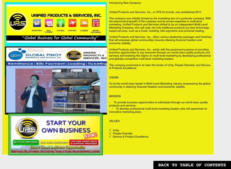 The company was initially formed as the marketing arm of a particular company. With the phenomenal growth of the company and its proven expertise in multi-level marketing, Unified Products and Services shifted to be an independent Multi-Level Marketing Company, who will cater not only traditional products but also technology-based services, such as e-Cash, ticketing, bills payments and universal loading.