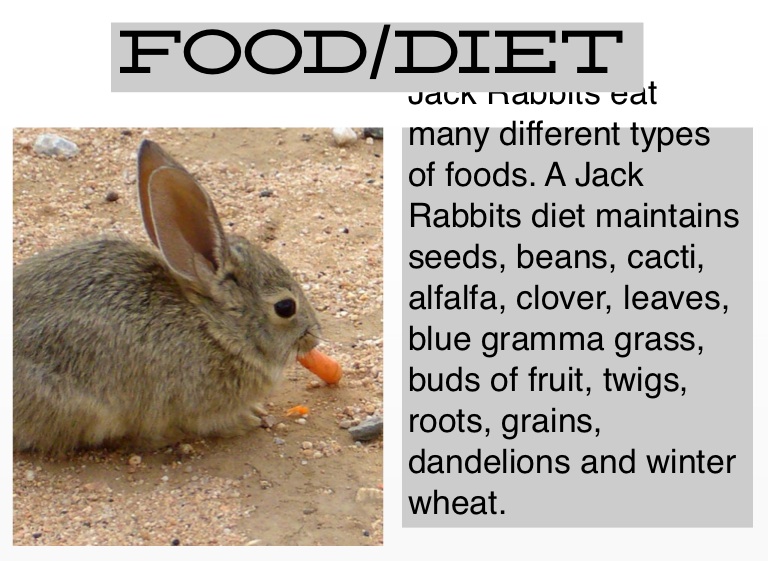 Jack Rabbits eat many different types of foods. A Jack Rabbits diet maintains seeds, beans, cacti, alfalfa, clover, leaves, blue gramma grass, buds of fruit, twigs, roots, grains, dandelions and winter wheat.