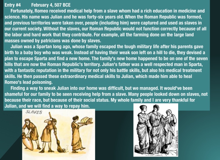 Fortunately, Romeo received medical help from a slave whom had a rich education in medicine and science. His name was Julian and he was forty-six years old. When the Roman Republic was formed, and previous territories were taken over, people (including him) were captured and used as slaves in our current society. Without the slaves, our Roman Republic would not function correctly because of all the labor and hard work that they contribute. For example, all the farming done on the large land masses owned by patricians was done by slaves.