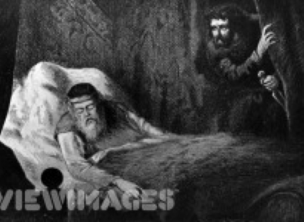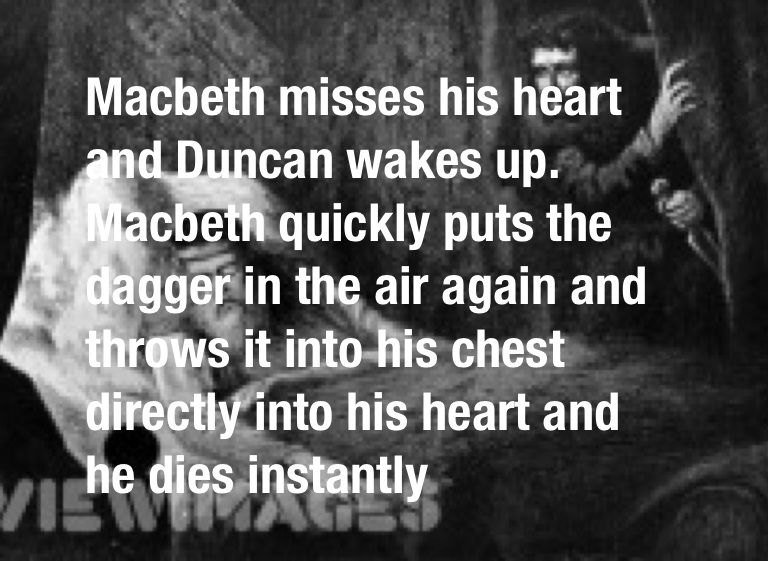 Macbeth misses his heart and Duncan wakes up. Macbeth quickly puts the dagger in the air again and throws it into his chest directly into his heart and he dies instantly