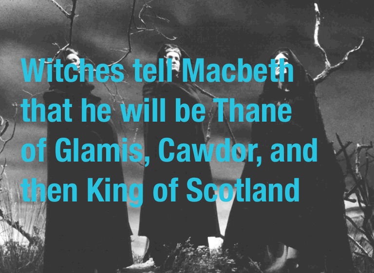 Witches tell Macbeth that he will be Thane of Glamis, Cawdor, and then King of Scotland