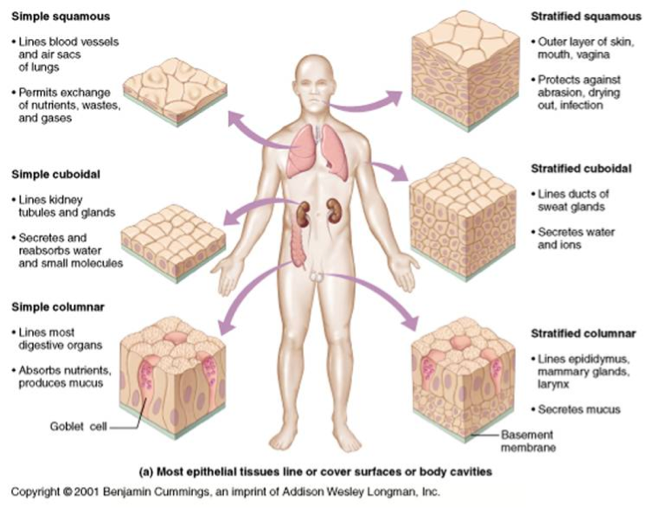 1.)It can either be simple(1 layer and used in areas that need filtration) or stratified(multi layered and used in high abrasion areas like skin or the lining of the mouth