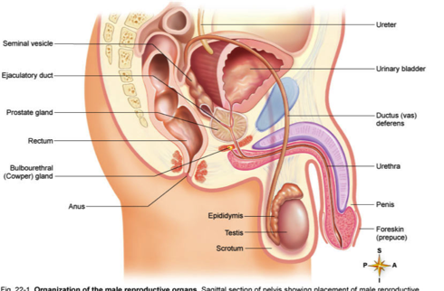 Includes prostate gland, testes, scrotum, ductus deferens, and penis