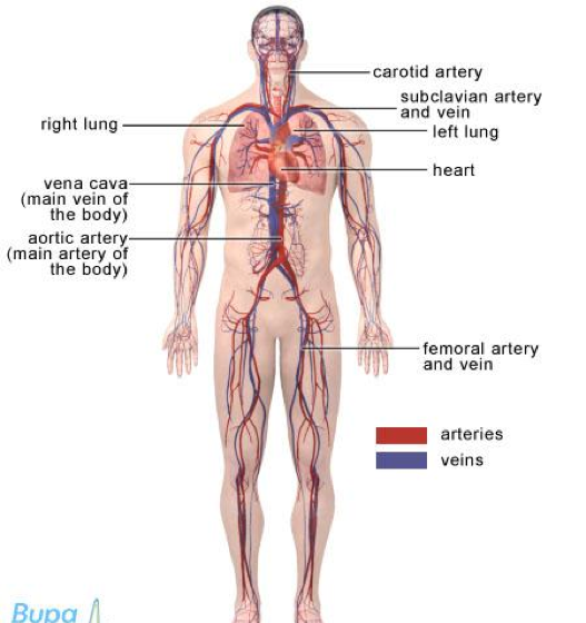 Includes the heart, blood vessels and arteries; blood vessels and arteries transport blood which contains oxygen and carbon dioxide, nutrients, wastes etc... And the heart pumps the blood throughout the body