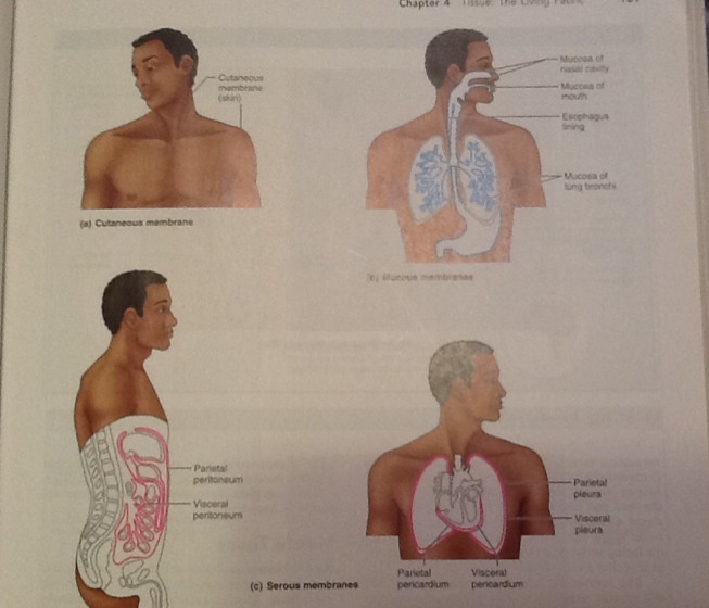 Cutaneous membrane- is your skin. It is keritinized, stratified squamous and attached to connective tissue