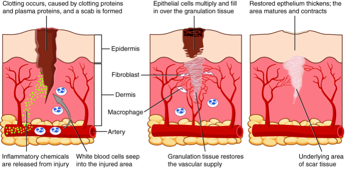 1. Inflammation sets the stage- blood vessels bleed, inflammatory chemicals are released, white blood vessels and clotting proteins are released, it dries and forms a scab