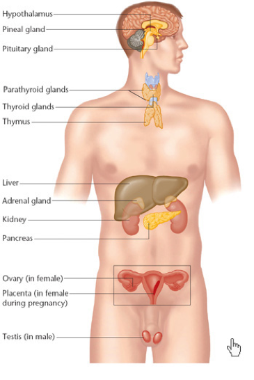 Includes the pineal gland, pituitary gland, thyroid gland, thymus, adrenal gland, pancreas, ovary, testes; It's job is to secrete hormones that regulate processes like growth, reproduction and nutrient use by body cells (metabolism)