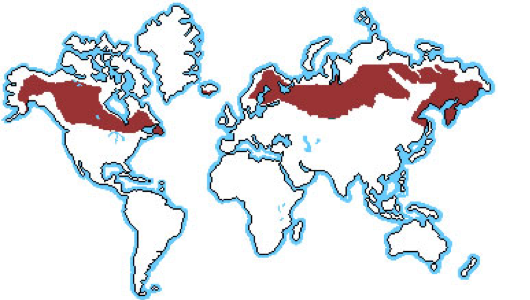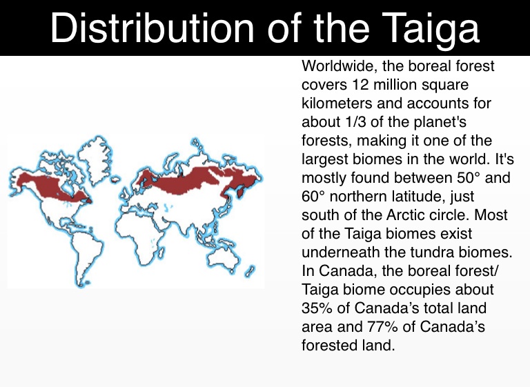 Worldwide, the boreal forest covers 12 million square kilometers and accounts for about 1/3 of the planet's forests, making it one of the largest biomes in the world. It's mostly found between 50° and 60° northern latitude, just south of the Arctic circle. Most of the Taiga biomes exist underneath the tundra biomes.