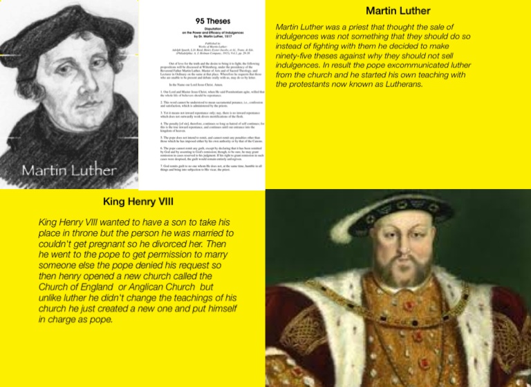 King Henry VIII wanted to have a son to take his place in throne but the person he was married to couldn't get pregnant so he divorced her. Then he went to the pope to get permission to marry someone else the pope denied his request so then henry opened a new church called the Church of England or Anglican Church but unlike luther he didn't change the teachings of his church he just created a new one and put himself in charge as pope.