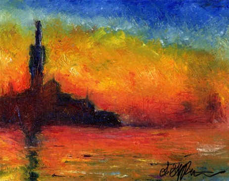 The contrast of colors between the dull buildings and the vibrant sea and sky communicate how man made creations cannot match the true beauty of nature seen everyday.