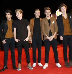 One Direction in February 2013, from left to right Louis Tomlinson,Harry styles, Liam Payne, Zayn Malik, Niall Horan American Music Awards, World Music Awards, Billbored Music awards,