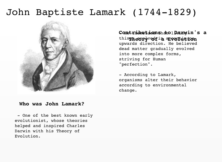 - One of the best known early evolutionist, whose theories helped and inspired Charles Darwin with his Theory of Evolution.