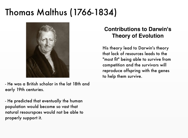 His theory lead to Darwin's theory that lack of resources leads to the "most fit" being able to survive from competition and the survivors will reproduce offspring with the genes to help them survive.