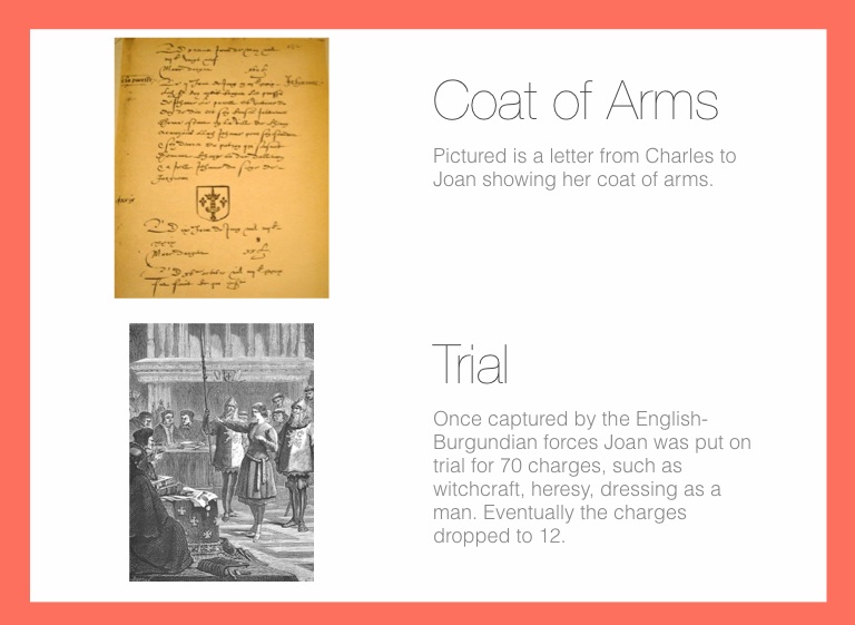 Once captured by the English-Burgundian forces Joan was put on trial for 70 charges, such as witchcraft, heresy, dressing as a man. Eventually the charges dropped to 12.