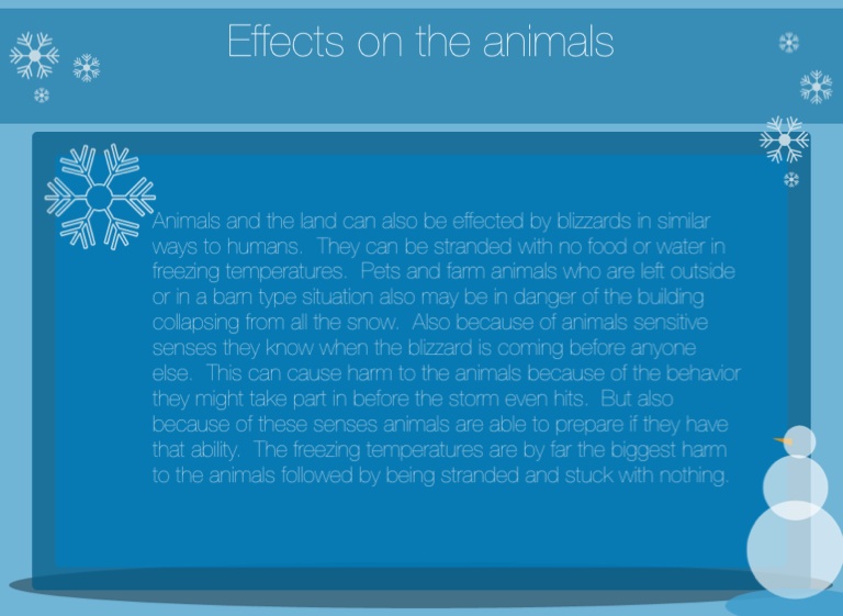 Animals and the land can also be effected by blizzards in similar ways to humans. They can be stranded with no food or water in freezing temperatures. Pets and farm animals who are left outside or in a barn type situation also may be in danger of the building collapsing from all the snow. Also because of animals sensitive senses they know when the blizzard is coming before anyone else. This can cause harm to the animals because of the behavior they might take part in before the storm even hits. But also because of these senses animals are able to prepare if they have that ability. The freezing temperatures are by far the biggest harm to the animals followed by being stranded and stuck with nothing.