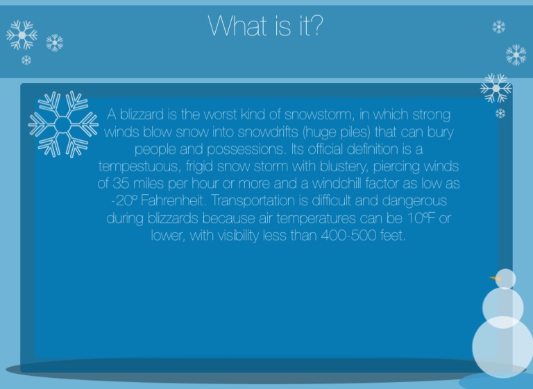 A blizzard is the worst kind of snowstorm, in which strong winds blow snow into snowdrifts (huge piles) that can bury people and possessions. Its official definition is a tempestuous, frigid snow storm with blustery, piercing winds of 35 miles per hour or more and a windchill factor as low as -20º Fahrenheit. Transportation is difficult and dangerous during blizzards because air temperatures can be 10ºF or lower, with visibility less than 400-500 feet.