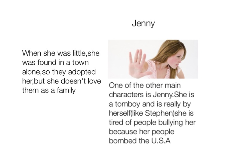 One of the other main characters is Jenny.She is a tomboy and is really by herself(like Stephen)she is tired of people bullying her because her people bombed the U.S.A