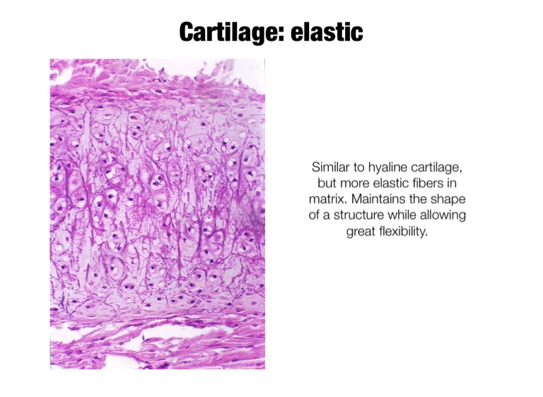 Similar to hyaline cartilage, but more elastic fibers in matrix. Maintains the shape of a structure while allowing great flexibility.