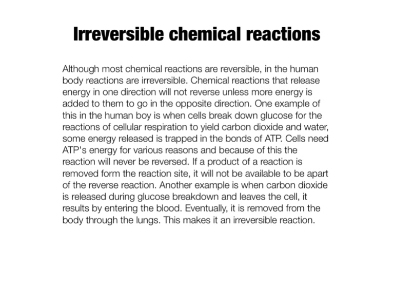 Although most chemical reactions are reversible, in the human body reactions are irreversible. Chemical reactions that release energy in one direction will not reverse unless more energy is added to them to go in the opposite direction. One example of this in the human boy is when cells break down glucose for the reactions of cellular respiration to yield carbon dioxide and water, some energy released is trapped in the bonds of ATP. Cells need ATP's energy for various reasons and because of this the reaction will never be reversed. If a product of a reaction is removed form the reaction site, it will not be available to be apart of the reverse reaction. Another example is when carbon dioxide is released during glucose breakdown and leaves the cell, it results by entering the blood. Eventually, it is removed from the body through the lungs. This makes it an irreversible reaction.