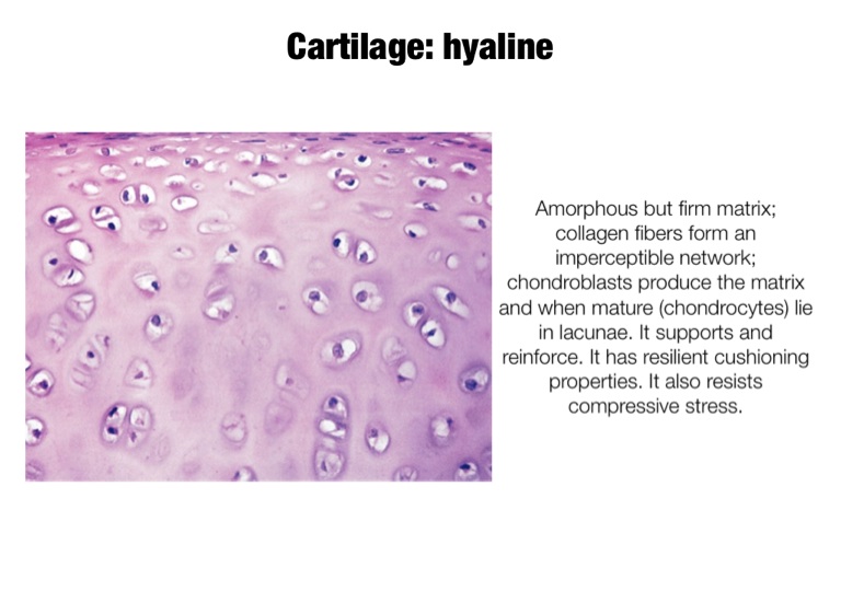 Amorphous but firm matrix; collagen fibers form an imperceptible network; chondroblasts produce the matrix and when mature (chondrocytes) lie in lacunae. It supports and reinforce. It has resilient cushioning properties. It also resists compressive stress.