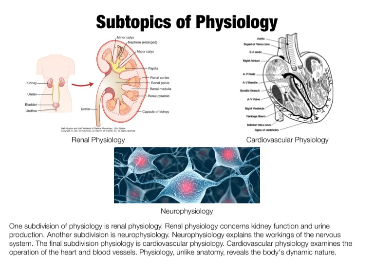 One subdivision of physiology is renal physiology. Renal physiology concerns kidney function and urine production. Another subdivision is neurophysiology. Neurophysiology explains the workings of the nervous system. The final subdivision physiology is cardiovascular physiology. Cardiovascular physiology examines the operation of the heart and blood vessels. Physiology, unlike anatomy, reveals the body's dynamic nature.