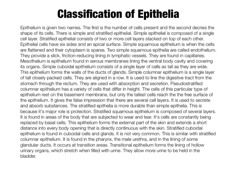 Epithelium is given two names. The first is the number of cells present and the second decries the shape of its cells. There is simple and stratified epithelial. Simple epithelial is composed of a single cell layer. Stratified epithelial consists of two or more cell layers stacked on top of each other. Epithelial cells have six sides and an apical surface. Simple squamous epithelium is when the cells are flattened and their cytoplasm is sparse. Two simple squamous epithelia are called endothelium. They provide a slick, friction-reducing lining in lymphatic vessels. They are found in capillaries. Mesothelium is epithelium found in serous membranes lining the ventral body cavity and covering its organs. Simple cuboidal epithelium consists of a single layer of cells as tall as they are wide. This epithelium forms the walls of the ducts of glands. Simple columnar epithelium is a single layer of tall closely packed cells. They are aligned in a row. It is used to line the digestive tract from the stomach through the rectum. They are used with absorption and secretion. Pseudostratified columnar epithelium has a variety of cells that differ in height. The cells of this particular type of epithelium rest on the basement membrane, but only the tallest cells reach the the free surface of the epithelium. It gives the false impression that there are several cell layers. It is used to secrete and absorb substances. The stratified epithelia is more durable than simple epithelia. This is because it's major role is protection. Stratified squamous epithelium is composed of several layers. It is found in areas of the body that are subjected to wear and tear. It's cells are constantly being replaced by basal cells. This epithelium forms the external part of the skin and extends a short distance into every body opening that is directly continuous with the skin. Stratified cuboidal epithelium is found in cuboidal cells and glands. It is not very common. This is similar with stratified columnar epithelium. It is found in the pharynx, the male urethra, and in the lining of some glandular ducts. It occurs at transition areas. Transitional epithelium forms the lining of hollow urinary organs, which stretch when filled with urine. They allow more urine to be held in the bladder.