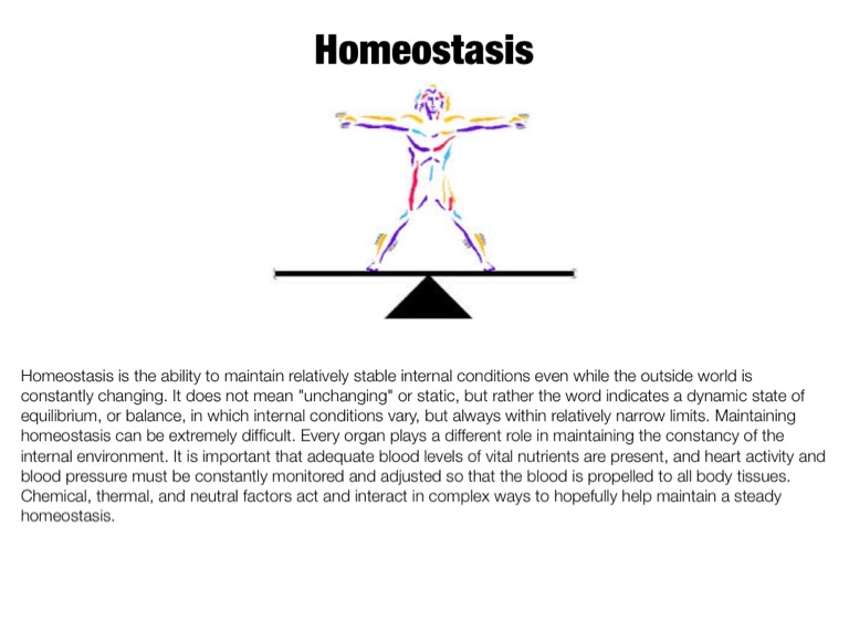 Homeostasis is the ability to maintain relatively stable internal conditions even while the outside world is constantly changing. It does not mean "unchanging" or static, but rather the word indicates a dynamic state of equilibrium, or balance, in which internal conditions vary, but always within relatively narrow limits. Maintaining homeostasis can be extremely difficult. Every organ plays a different role in maintaining the constancy of the internal environment. It is important that adequate blood levels of vital nutrients are present, and heart activity and blood pressure must be constantly monitored and adjusted so that the blood is propelled to all body tissues. Chemical, thermal, and neutral factors act and interact in complex ways to hopefully help maintain a steady homeostasis.