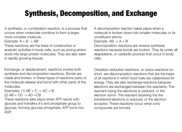 Decomposition reactions are reverse synthesis reactions because bonds are broken. They lie under all degradative, or catabolic process that occur in body cells.