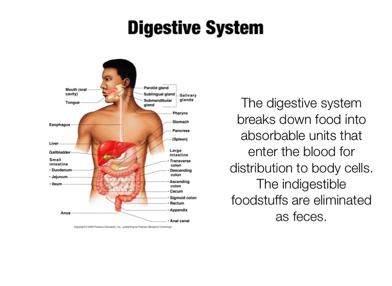 The digestive system breaks down food into absorbable units that enter the blood for distribution to body cells. The indigestible foodstuffs are eliminated as feces.