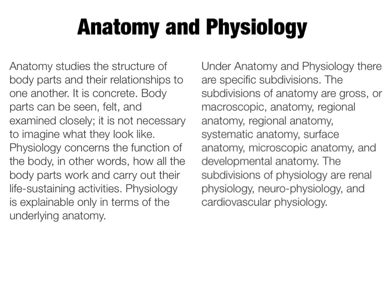 Anatomy studies the structure of body parts and their relationships to one another. It is concrete. Body parts can be seen, felt, and examined closely; it is not necessary to imagine what they look like. Physiology concerns the function of the body, in other words, how all the body parts work and carry out their life-sustaining activities. Physiology is explainable only in terms of the underlying anatomy.