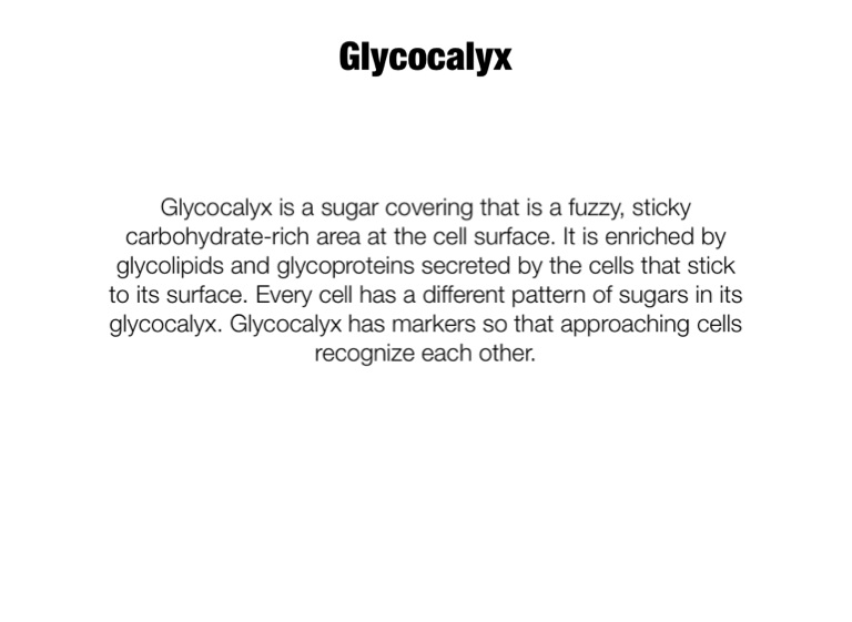 Glycocalyx is a sugar covering that is a fuzzy, sticky carbohydrate-rich area at the cell surface. It is enriched by glycolipids and glycoproteins secreted by the cells that stick to its surface. Every cell has a different pattern of sugars in its glycocalyx. Glycocalyx has markers so that approaching cells recognize each other.
