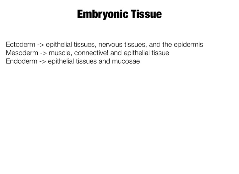 Ectoderm -> epithelial tissues, nervous tissues, and the epidermis