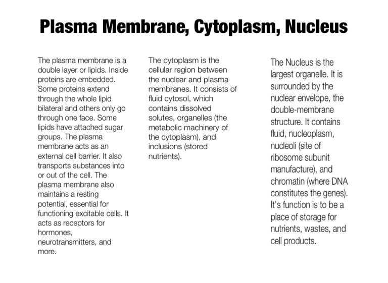 The plasma membrane is a double layer or lipids. Inside proteins are embedded. Some proteins extend through the whole lipid bilateral and others only go through one face. Some lipids have attached sugar groups. The plasma membrane acts as an external cell barrier. It also transports substances into or out of the cell. The plasma membrane also maintains a resting potential, essential for functioning excitable cells. It acts as receptors for hormones, neurotransmitters, and more.