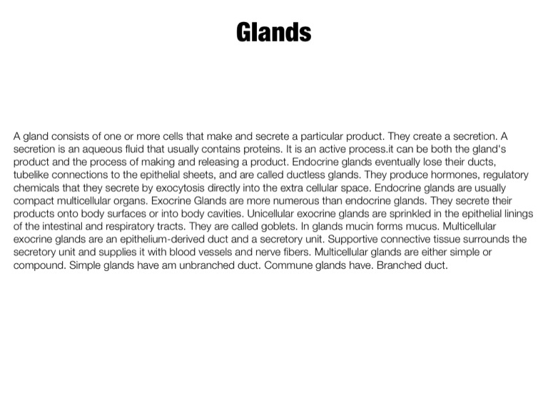 A gland consists of one or more cells that make and secrete a particular product. They create a secretion. A secretion is an aqueous fluid that usually contains proteins. It is an active process.it can be both the gland's product and the process of making and releasing a product. Endocrine glands eventually lose their ducts, tubelike connections to the epithelial sheets, and are called ductless glands. They produce hormones, regulatory chemicals that they secrete by exocytosis directly into the extra cellular space. Endocrine glands are usually compact multicellular organs. Exocrine Glands are more numerous than endocrine glands. They secrete their products onto body surfaces or into body cavities. Unicellular exocrine glands are sprinkled in the epithelial linings of the intestinal and respiratory tracts. They are called goblets. In glands mucin forms mucus. Multicellular exocrine glands are an epithelium-derived duct and a secretory unit. Supportive connective tissue surrounds the secretory unit and supplies it with blood vessels and nerve fibers. Multicellular glands are either simple or compound. Simple glands have am unbranched duct. Commune glands have. Branched duct.