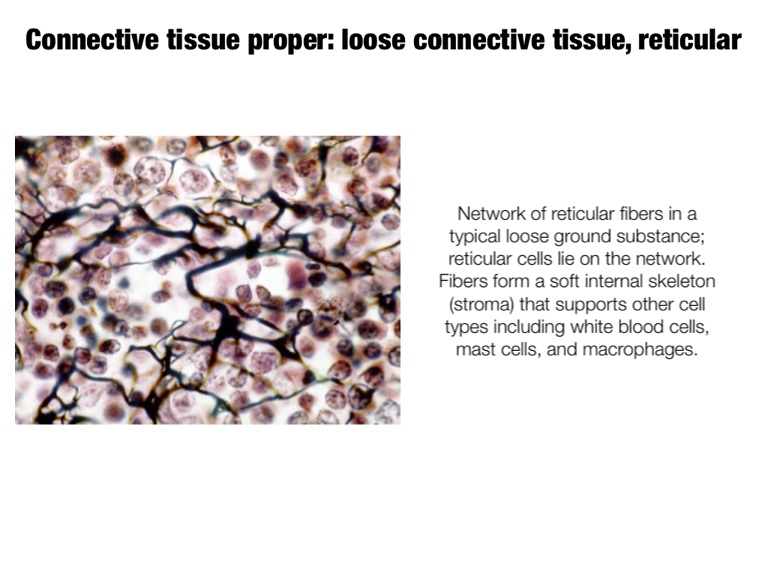 Network of reticular fibers in a typical loose ground substance; reticular cells lie on the network. Fibers form a soft internal skeleton (stroma) that supports other cell types including white blood cells, mast cells, and macrophages.