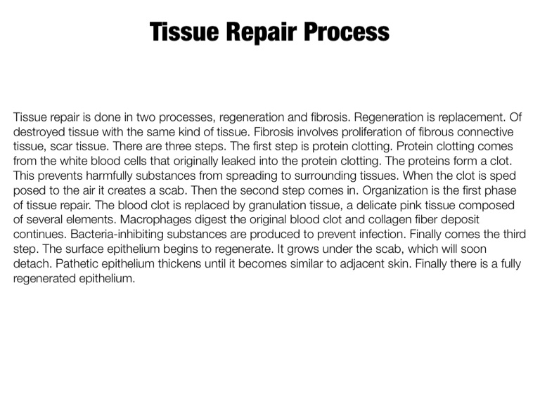 Tissue repair is done in two processes, regeneration and fibrosis. Regeneration is replacement. Of destroyed tissue with the same kind of tissue. Fibrosis involves proliferation of fibrous connective tissue, scar tissue. There are three steps. The first step is protein clotting. Protein clotting comes from the white blood cells that originally leaked into the protein clotting. The proteins form a clot. This prevents harmfully substances from spreading to surrounding tissues. When the clot is sped posed to the air it creates a scab. Then the second step comes in. Organization is the first phase of tissue repair. The blood clot is replaced by granulation tissue, a delicate pink tissue composed of several elements. Macrophages digest the original blood clot and collagen fiber deposit continues. Bacteria-inhibiting substances are produced to prevent infection. Finally comes the third step. The surface epithelium begins to regenerate. It grows under the scab, which will soon detach. Pathetic epithelium thickens until it becomes similar to adjacent skin. Finally there is a fully regenerated epithelium.