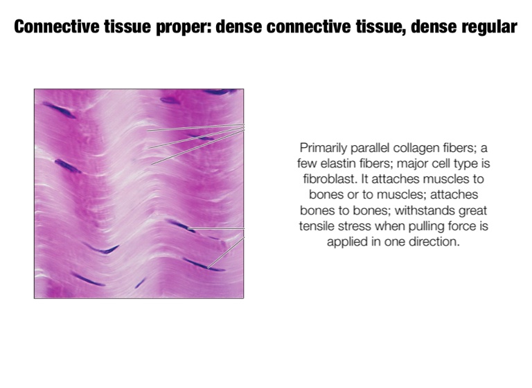 Primarily parallel collagen fibers; a few elastin fibers; major cell type is fibroblast. It attaches muscles to bones or to muscles; attaches bones to bones; withstands great tensile stress when pulling force is applied in one direction.