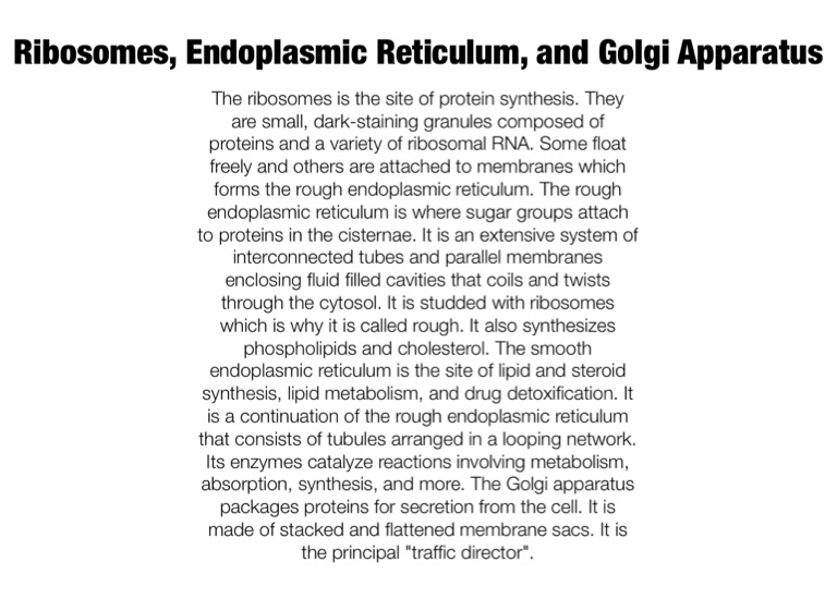 The ribosomes is the site of protein synthesis. They are small, dark-staining granules composed of proteins and a variety of ribosomal RNA. Some float freely and others are attached to membranes which forms the rough endoplasmic reticulum. The rough endoplasmic reticulum is where sugar groups attach to proteins in the cisternae. It is an extensive system of interconnected tubes and parallel membranes enclosing fluid filled cavities that coils and twists through the cytosol. It is studded with ribosomes which is why it is called rough. It also synthesizes phospholipids and cholesterol. The smooth endoplasmic reticulum is the site of lipid and steroid synthesis, lipid metabolism, and drug detoxification. It is a continuation of the rough endoplasmic reticulum that consists of tubules arranged in a looping network. Its enzymes catalyze reactions involving metabolism, absorption, synthesis, and more. The Golgi apparatus packages proteins for secretion from the cell. It is made of stacked and flattened membrane sacs. It is the principal "traffic director".